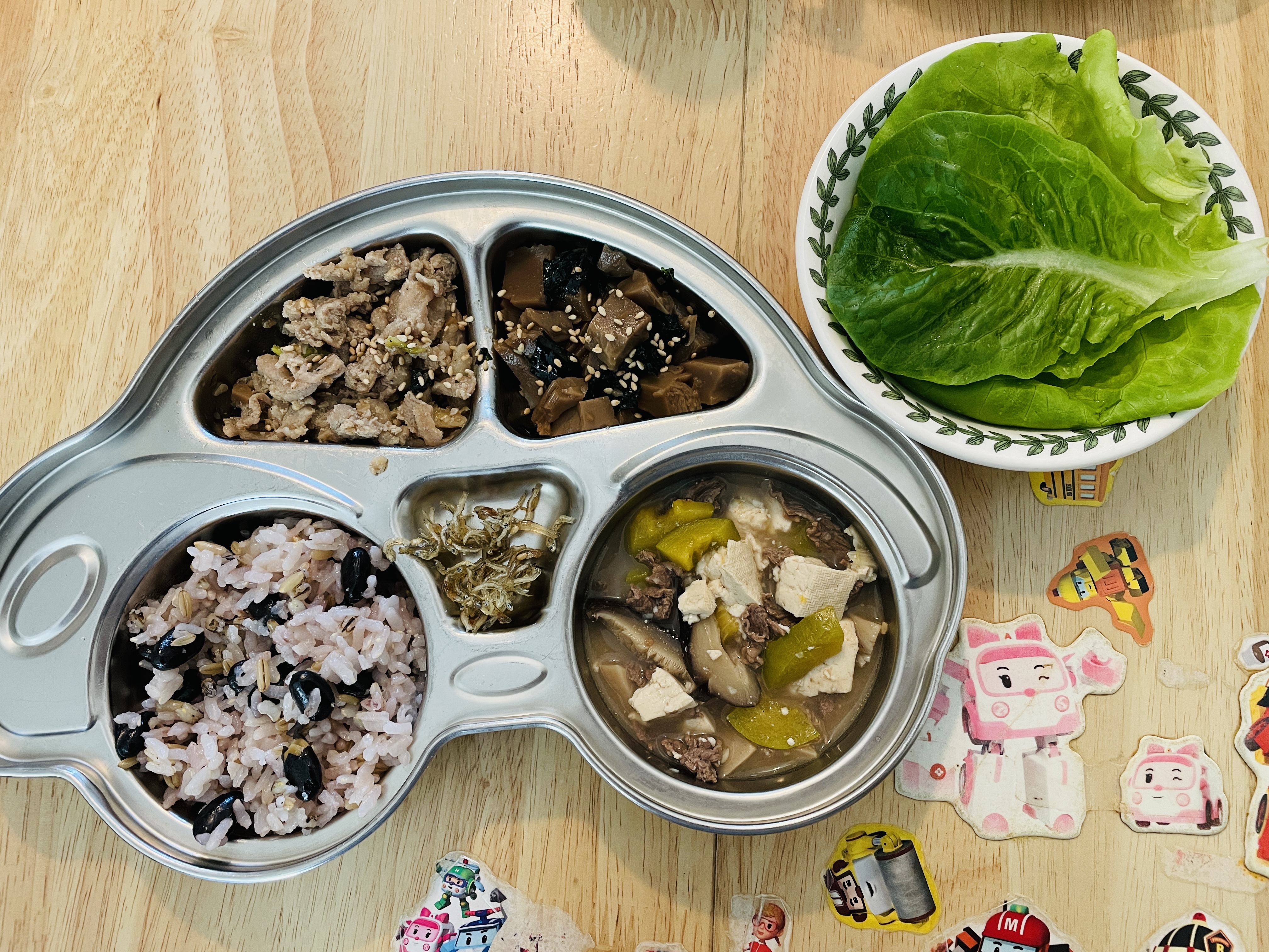 불고기랑 된장국, 멸치조림이랑 같이 담았다. 검은콩 넣고 잡곡밥을 했는데 확실히 밥에 뭐 들어간 걸 잘 먹는다.